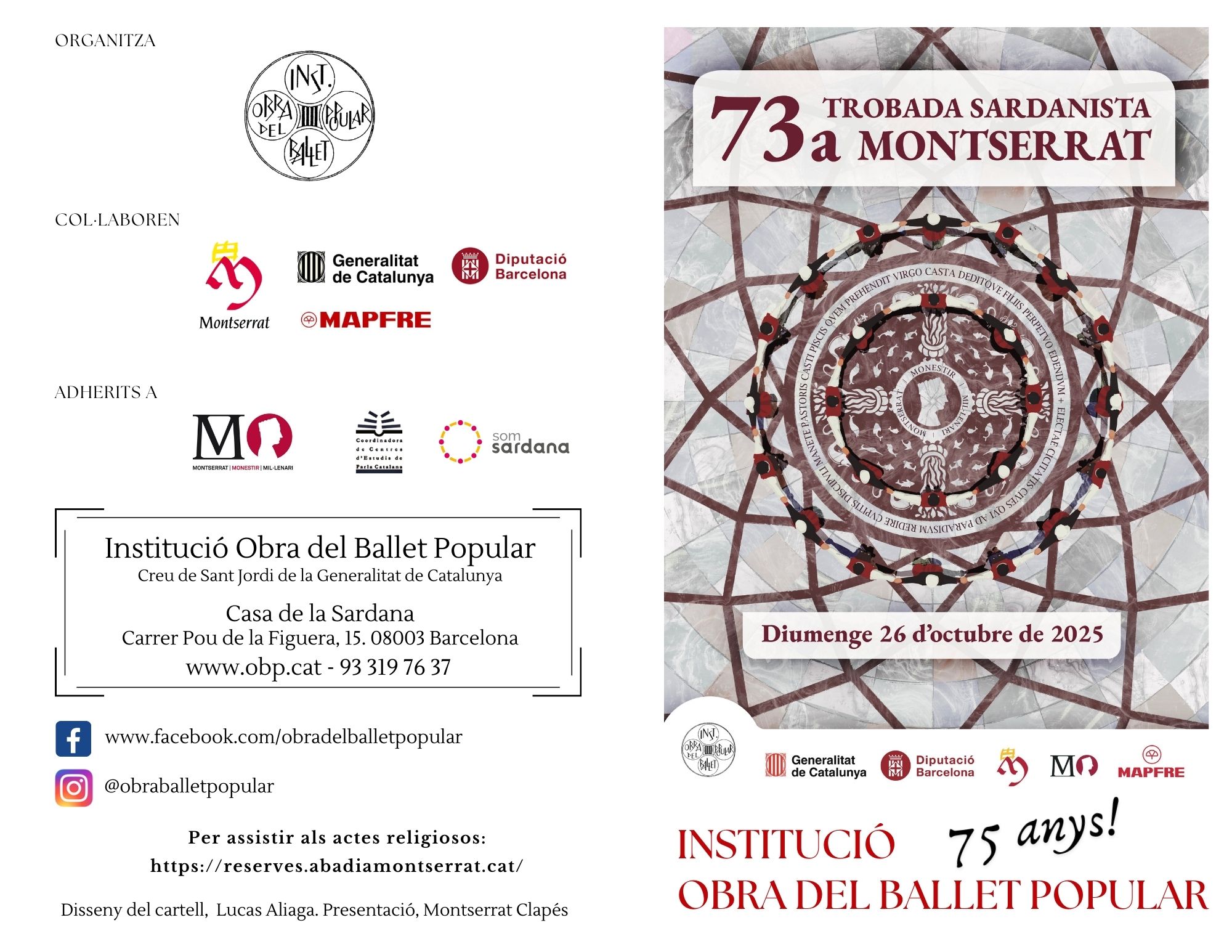 El pròxim dissabte 26 d’abril Montserrat acollirà una ballada de sardanes ben especial. A mitjanit, en acabar la vetlla de Santa Maria i l’espectacle de drons, la cobla Ciutat de Granollers oferirà una ballada de sardanes ben singular per celebrar el Mil·lenari i el 75è aniversari de l’Obra del Ballet Popular. Més informació: https://www.millenarimontserrat.cat/