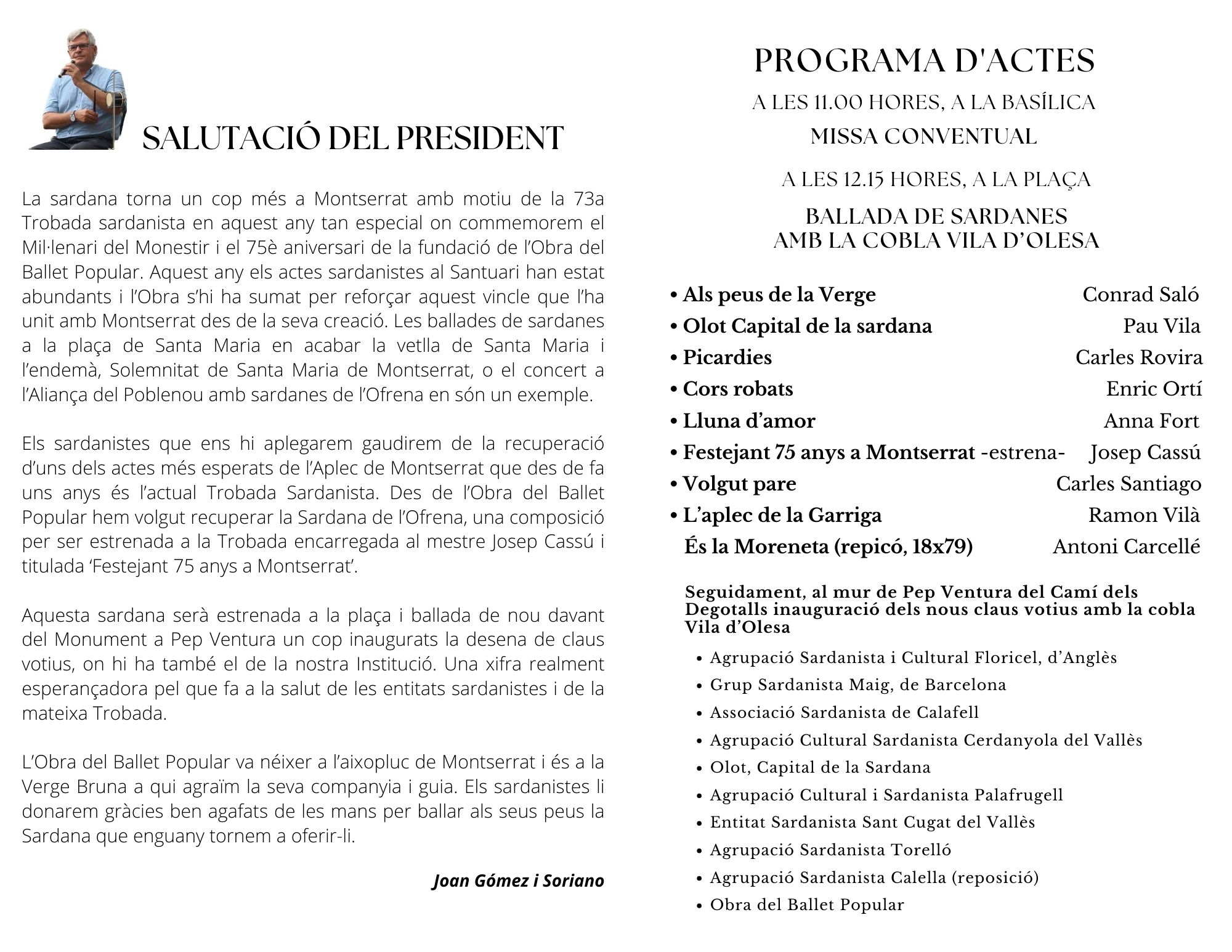 El pròxim diumenge 26 d’octubre, gran diada a Montserrat per celebrar els 75 anys de la nostra Institució en el marc del Mil·lenari. La cobla Vila d’Olesa, estrenarà una sardana de Josep Cassú durant la ballada, una composició que porta per títol ‘Festejant 75 anys a Montserrat’. Us hi esperem! Més informació en aquesta notícia: https://somsardana.cat/sardanisme/noticies/montserrat-trobada-sardanista-millenari